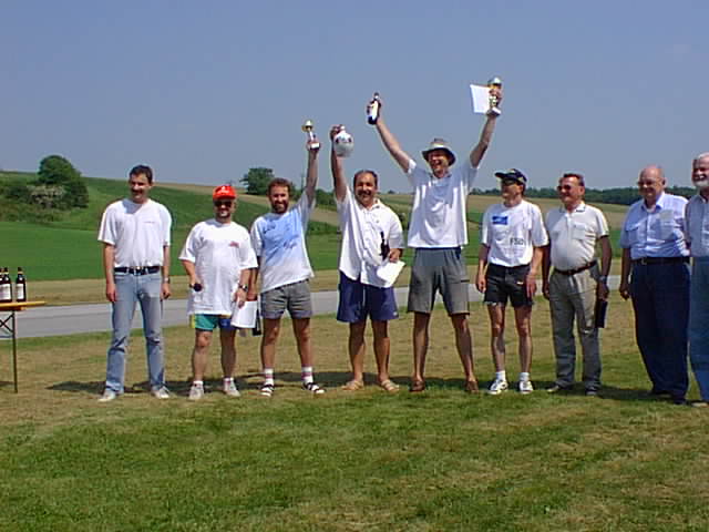 Die Sieger (von links nach rechts: Guntmar Rüb, Rudi Freudenthaler, Florian Lang) zeigen ihre Pokale, Urkunden und Weinflaschen... |