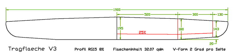 Dies ist der Urahn der V-Reihe... Florian Lang, Norbert Hübner und Hannes Delago (damals noch nicht im Team Ariane) bauten dieses Modell für die Saison 1993 (oder war's 1992 - weiß nicht mehr so genau). Außer einer Zeichnung des Flügels existieren keine Unterlagen mehr. Der Flügel entstand aus einem alten "Surprise" von Rudi Freudenthaler, der Rumpf jedoch war völlig neu und überlebte in wesentlichen Zügen (durch wiederholtes Abschleifen und Verkleinern des Urmodells) bis zur aktuellen V7. Die V3 hatte ein sog. "Y-Leitwerk", d.h. das V-Leitwerk sitzt nicht direkt auf dem Rumpf, sondern auf einem kleinen Leitwerksstummel, der auch das Höhenruderservo enthält.