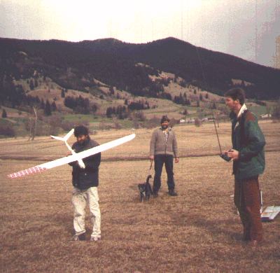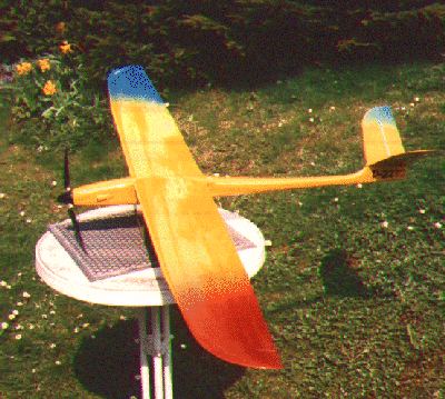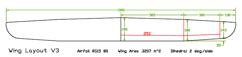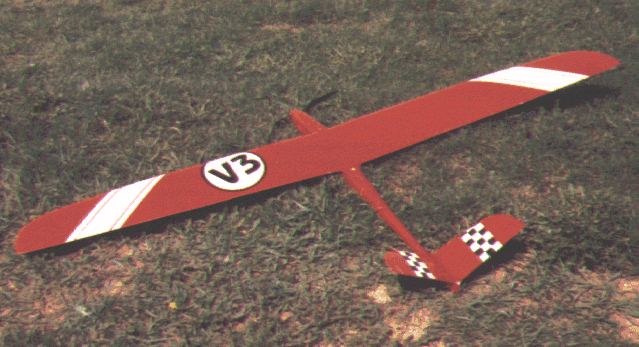 This is the "grandfather" of the V-Series. Florian Lang, Norbert Hübner and Hannes Delago (not with Team Ariane at that time) built this plane for the 1993 contest season (or was it 1992, oh never mind). I didn't find any drawings other than the wing layout below. The wing was in fact based on an old "Surprise" by Rudi Freudenthaler while the fuse was totally different and its main features basically survived (thru repeated "recycling" of the fuse male plug) up to our latest design, the V7. The V3 had a so-called "Y-Tail" - a V-Tail which didn't sit directly on top of the fuse but on a small fin which also houses the elevator servo.