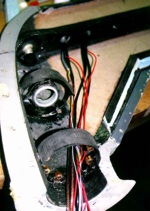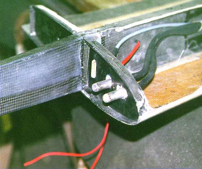 | Der Scharnierstift geht über die gesamte Ruderlänge und ist in Hülsen gelagert, die von der Faserstruktur umschlungen werden. | |